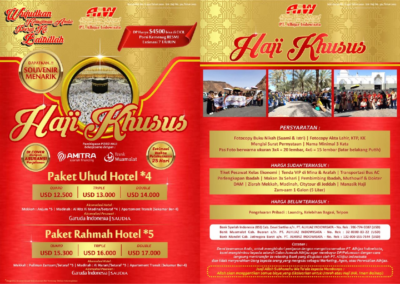 Alhijaz Indowisata merupakan sebuah perusahaan Biro Travel Umroh & Haji Khusus yang sudah berdisi sejak tahun 2000, dan memiliki izin umroh Penyelenggara Perjalanan Ibadah Umrah (PPIU) NO.U 490/2021 dan Izin haji Penyelenggara Ibadah Haji Khusus (PIHK) No.KMA 233/2021.